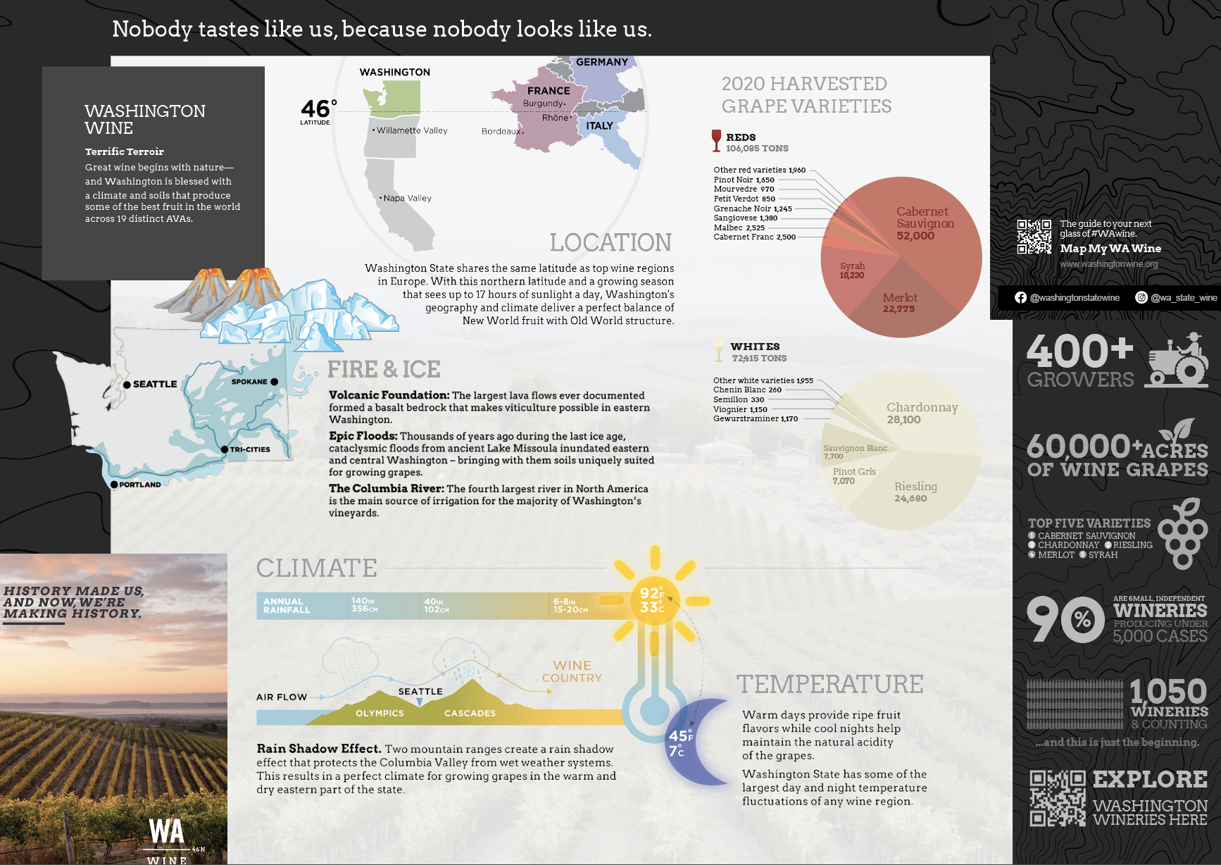 One of the first projects I worked on for the Washington Wine Commission was designing an interactive map that used weather data from WSU to help Washington wineries and vineyards choose the location and time to grow and purchase their grapes. This map became a great resource for the trade, but was not as useful to the tourists in the wine industry.