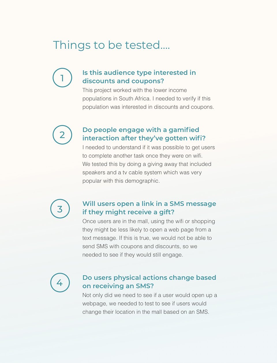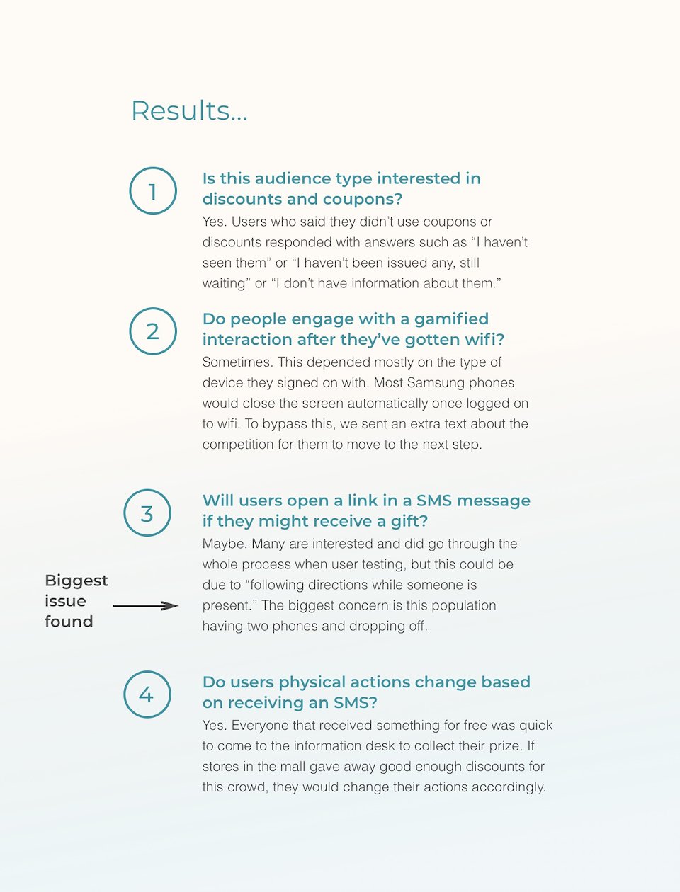 Solution: Partner with businesses within the mall to display coupons and discounts when people signed on to wifi. Also, send SMS to participants with those same coupons and discounts to encourage users to shop at those stores while they are at the mall. We needed to test these solutions before implementing them in all malls. I conducted research via in person surveys, moderated user testing, and quantitative usage data.