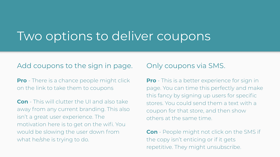 Most users in this population had two cell phones because it was less expensive to have data on one type of phone and air time on another type of phone. When we asked people to log into their wifi, they would put in their airtime number. Then when they received an SMS on their airtime phone with a link, they would have to take out their other phone and manually enter it in. I’m surprised at the persistence of this audience and that we had gotten so much traction through our whole user flow. They were very motivated by the prizes that we chose, but this was a pain point that we needed to take into consideration when only sharing discounts and coupons.