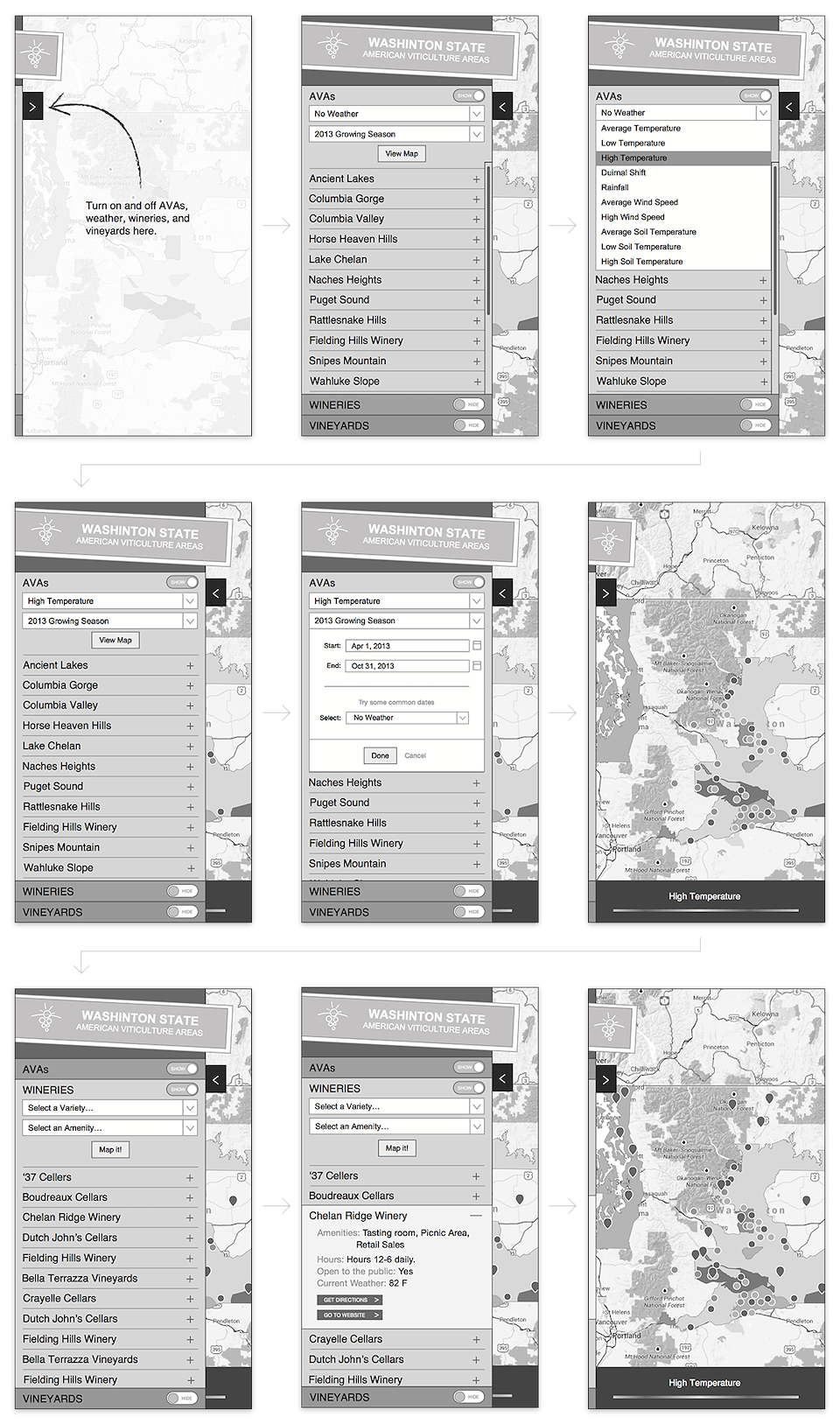 In order for the map to be useful for people visiting wineries and vineyards around the state, the tourist information needed be added to the map. Since we were also designing the map for a new audience that would be using the map on their phone while touring, we had to make the map mobile friendly. To let people customize the information they were looking for on the map, we added multiple switches to turn on climate, AVAs, wineries, and vineyards. We moved the weather and data drop down within the weather section, and then added a way to turn off the AVAs in case the information was not important to the current user. Finally, winery and vineyard pins were added to the map with their own on/off ui.