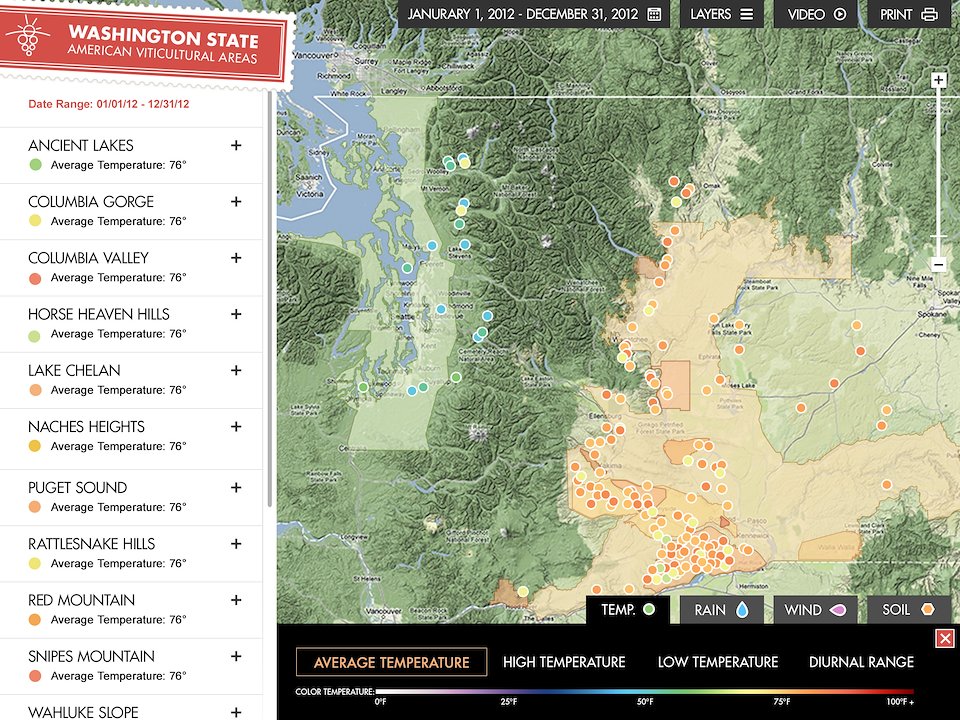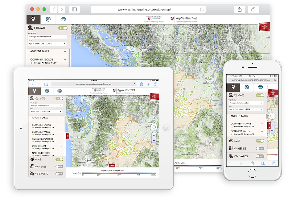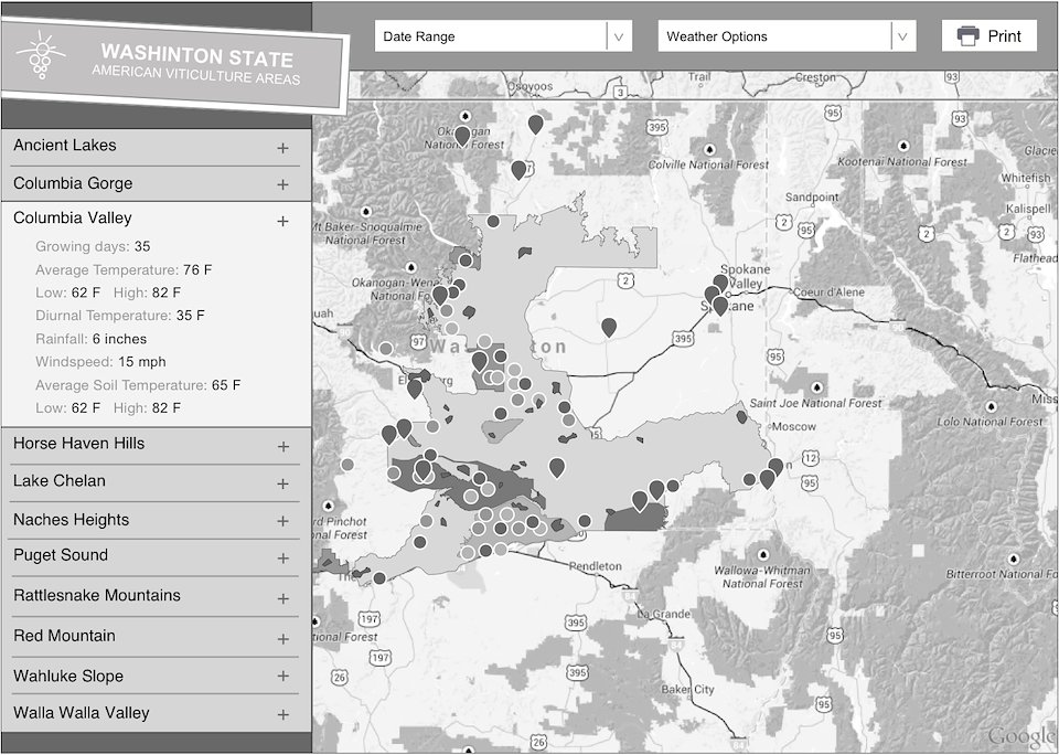 One of the first projects I worked on for the Washington Wine Commission was designing an interactive map that used weather data from WSU to help Washington wineries and vineyards choose the location and time to grow and purchase their grapes. This map became a great resource for the trade, but was not as useful to the tourists in the wine industry.