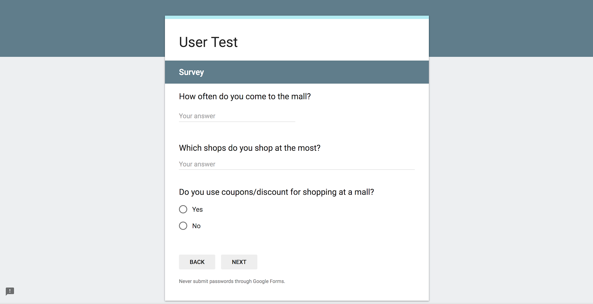 - Interested in coupons and discounts would be discovered via in person survey. My team approached people walking by the information booth in the mall, and sent them to me. I read aloud the survey I had created on Google docs to keep their attention and gauge their depth when giving answers. After surveying them, I also asked them if they had signed onto the wifi in the mall. If they hadn’t, I asked if I could watch them sign onto the wifi, so I could see the rest of our user flow in action.