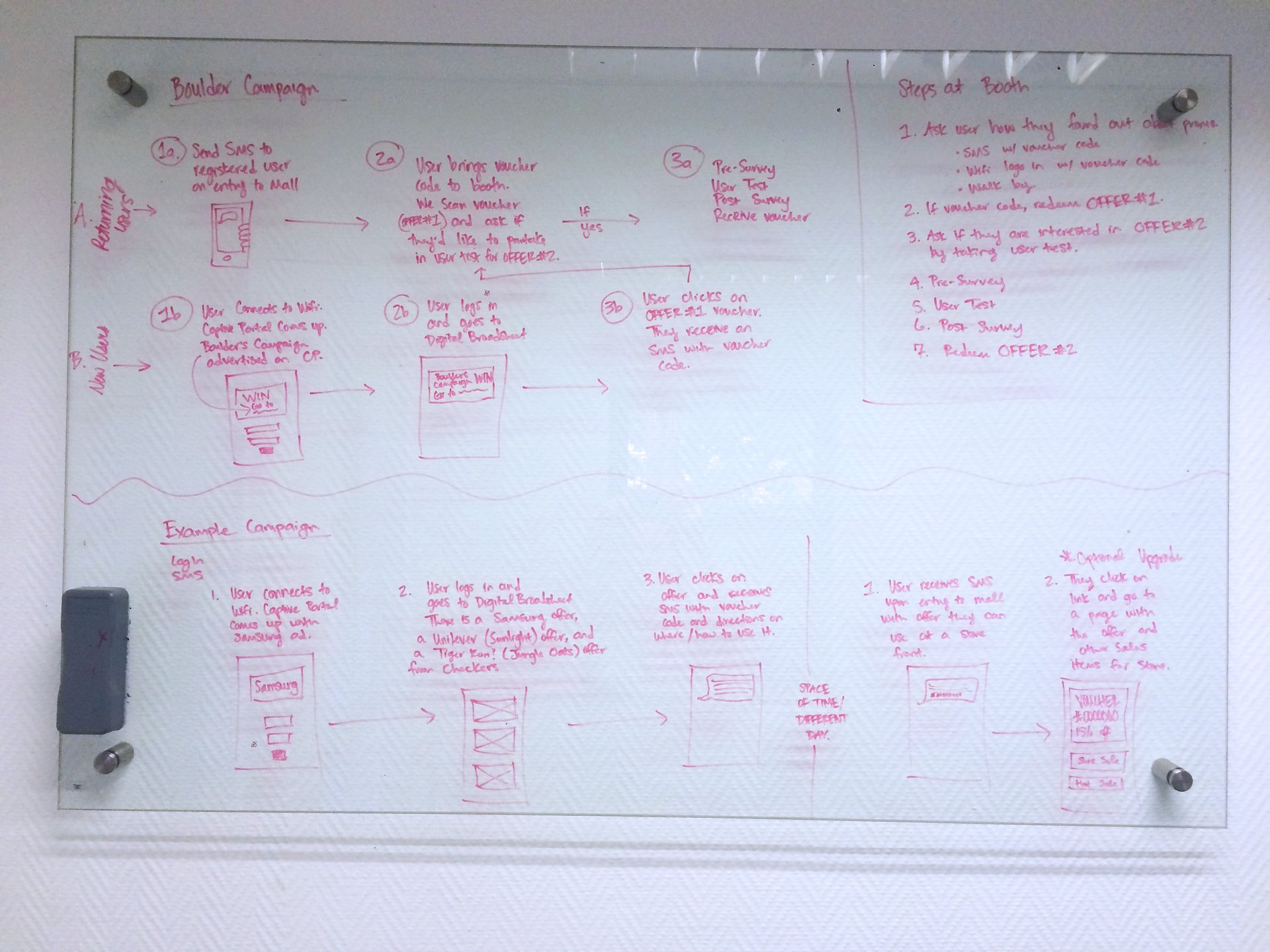 Solution: Partner with businesses within the mall to display coupons and discounts when people signed on to wifi. Also, send SMS to participants with those same coupons and discounts to encourage users to shop at those stores while they are at the mall. We needed to test these solutions before implementing them in all malls. I conducted research via in person surveys, moderated user testing, and quantitative usage data.