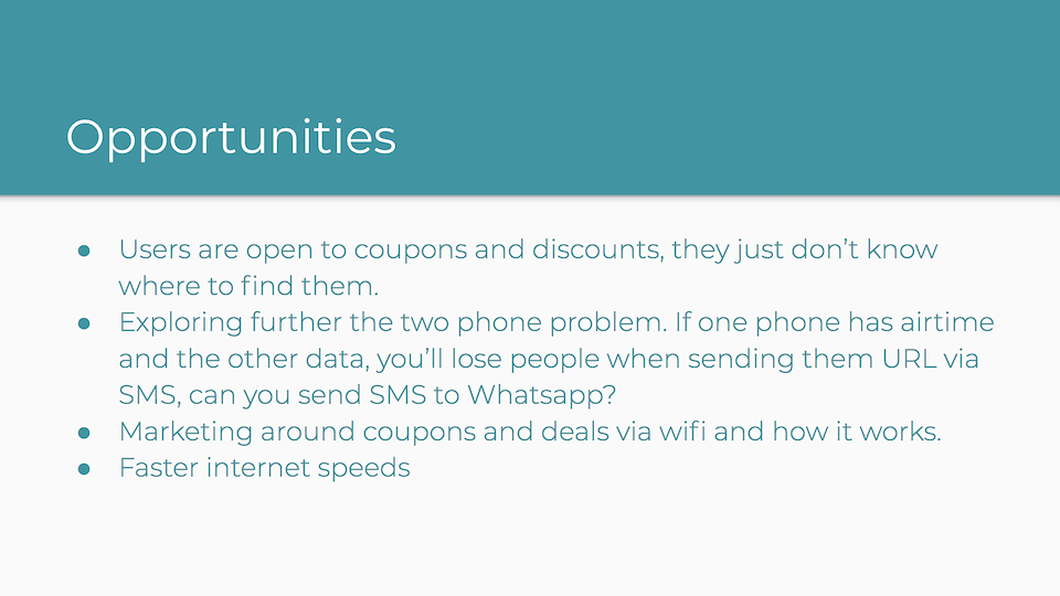 Most users in this population had two cell phones because it was less expensive to have data on one type of phone and air time on another type of phone. When we asked people to log into their wifi, they would put in their airtime number. Then when they received an SMS on their airtime phone with a link, they would have to take out their other phone and manually enter it in. I’m surprised at the persistence of this audience and that we had gotten so much traction through our whole user flow. They were very motivated by the prizes that we chose, but this was a pain point that we needed to take into consideration when only sharing discounts and coupons.