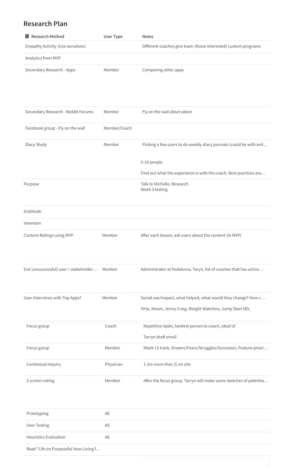 During the retrospective with Itrim by Monj, individuals wrote down anything that was in their “parking lot.” This parking lot consisted of concerns or other ideas that we didn’t discuss to stay focused. Then each person was able to vote for their top three on the whiteboard. Based off of this and the information I had gather during interviews and the design thinking workshop, I crafted a research strategy. Then with the help of the CTO we put together a timeline to execute the research.